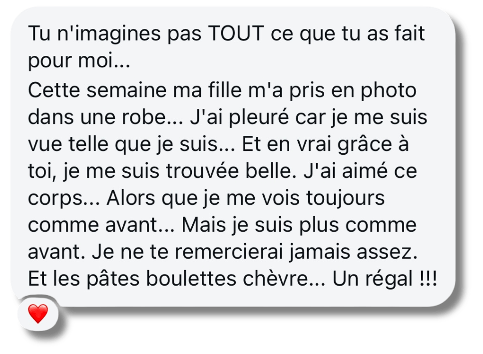 → Et chaque semaine, je te contacte pour faire le point, ajuster, te motiver. Tu n’es jamais seule dans ce parcours.