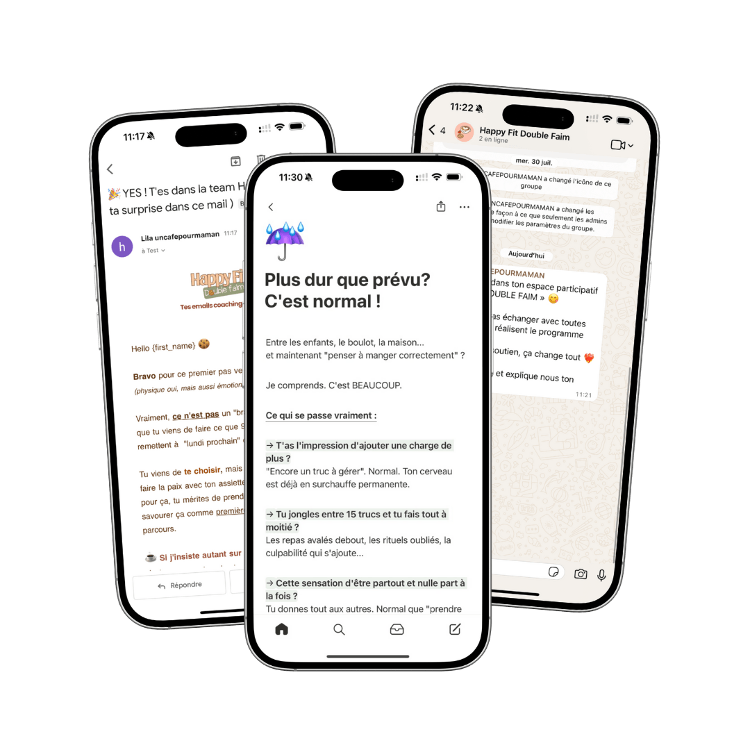 PARFAIT ! Happy Fit Double Faim est calibré pour les mamans speed : les recettes sont rapides à préparer, et il n'y a pas de "devoir" a faire pour avancer ! Et surtout : Tout sur ton tel, accessible partout.