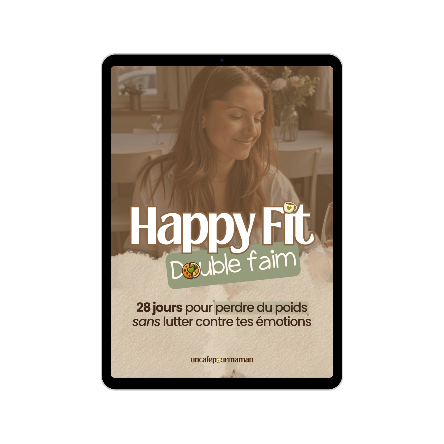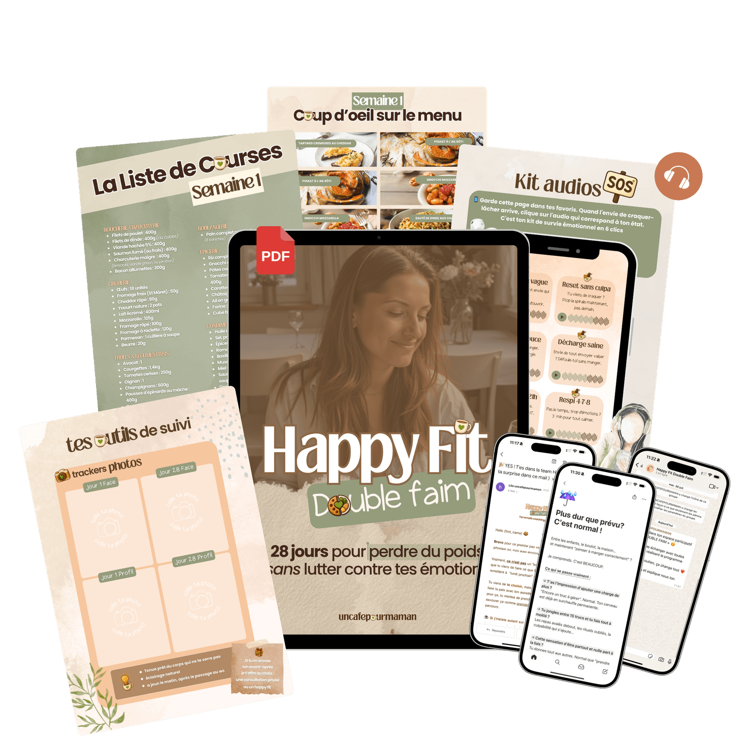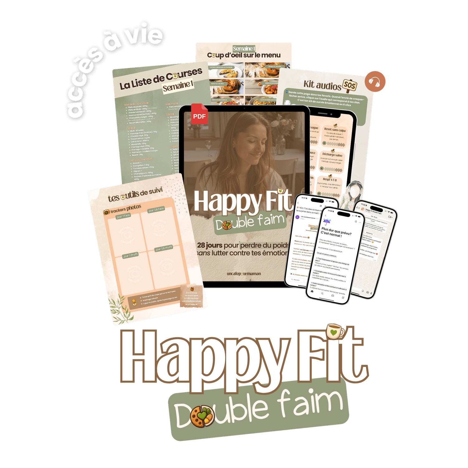 Le Happy Fit Double Faim t'apporte Satiété + plaisir dans l'assiette + outils émotionnels = plus de craquages, perte de poids naturelle.