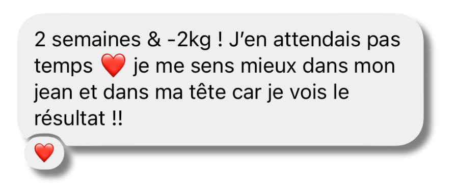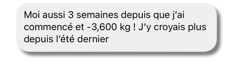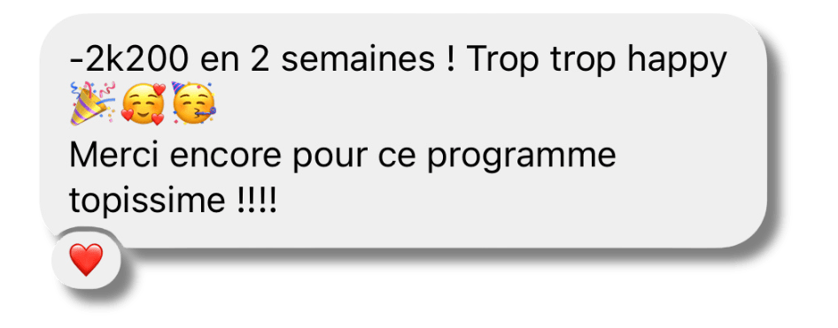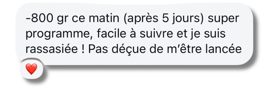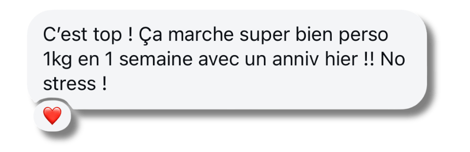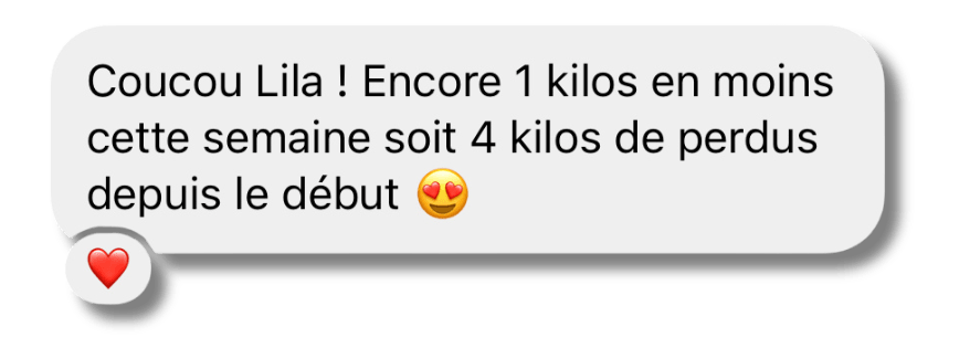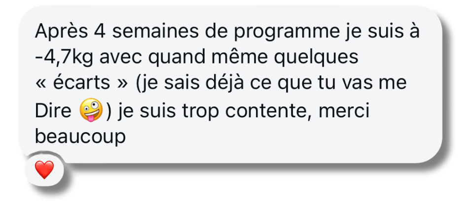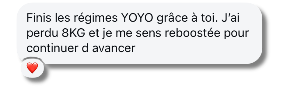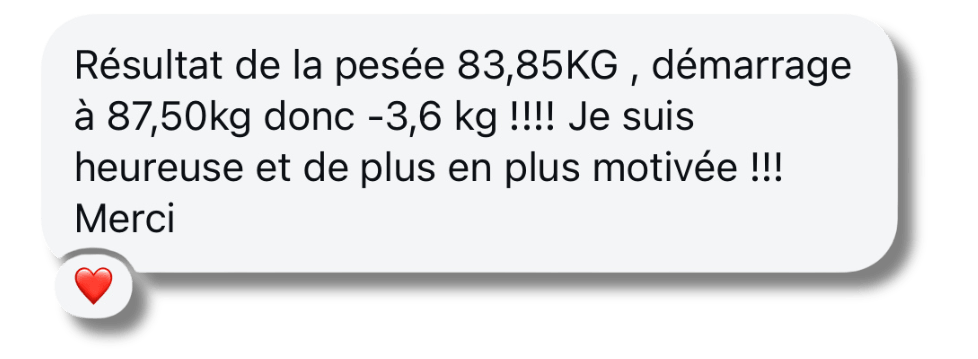 Je gère sans stress grâce à toi et le résultat est au delà de mes espérances presque 7 kg perdu. Quel chemin parcouru, pas seulement niveau kilos mais aussi psychologiquement et émotionnellement.